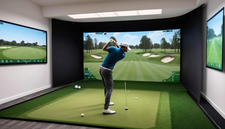 A basement golf simulator offers a private and controlled environment for year-round practice.